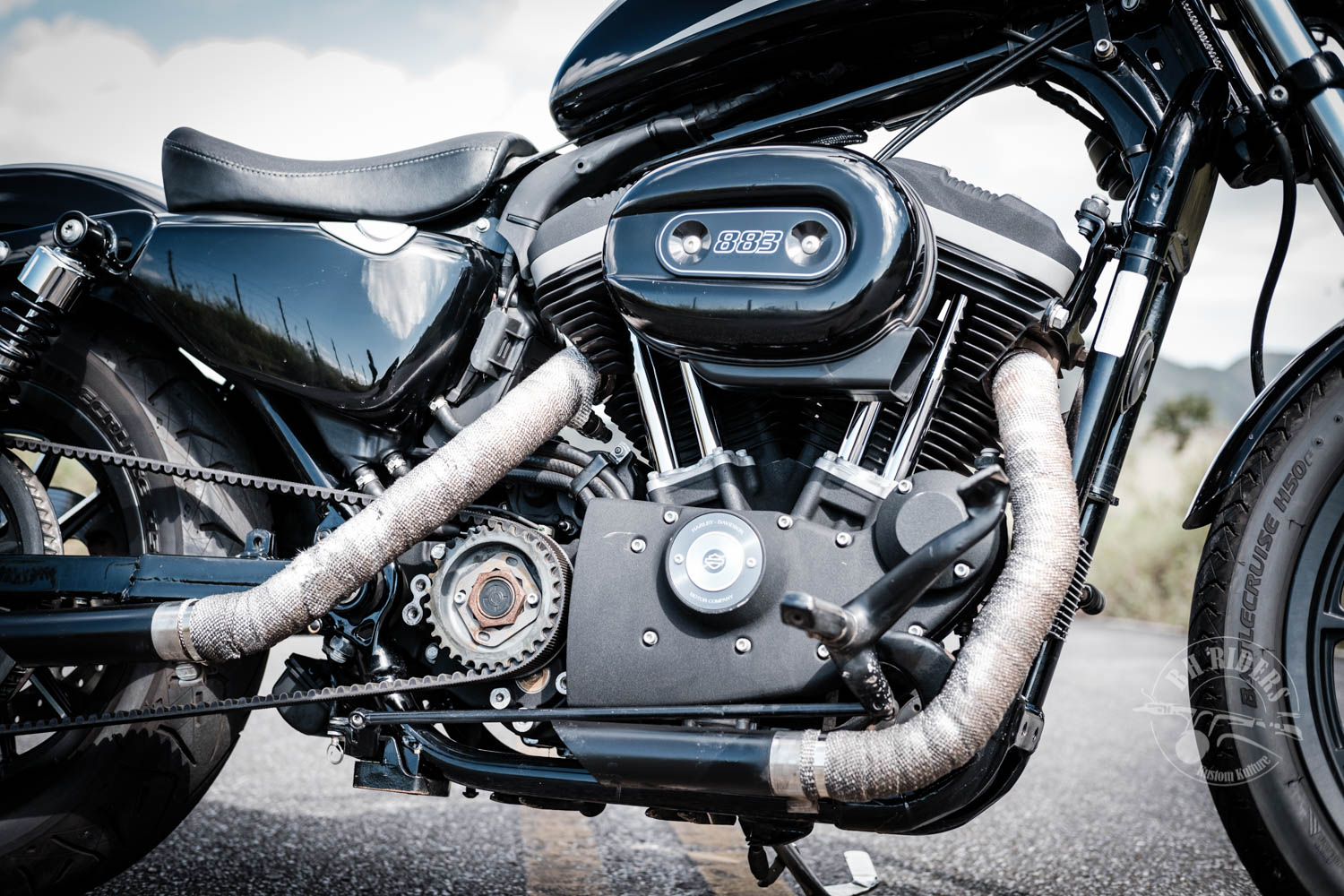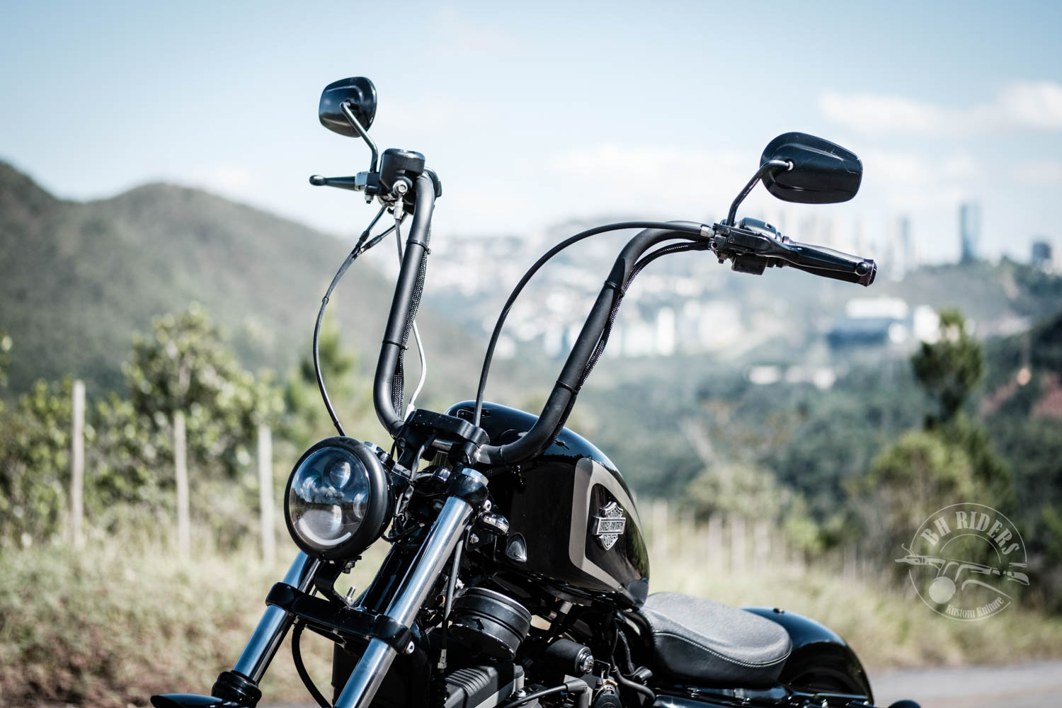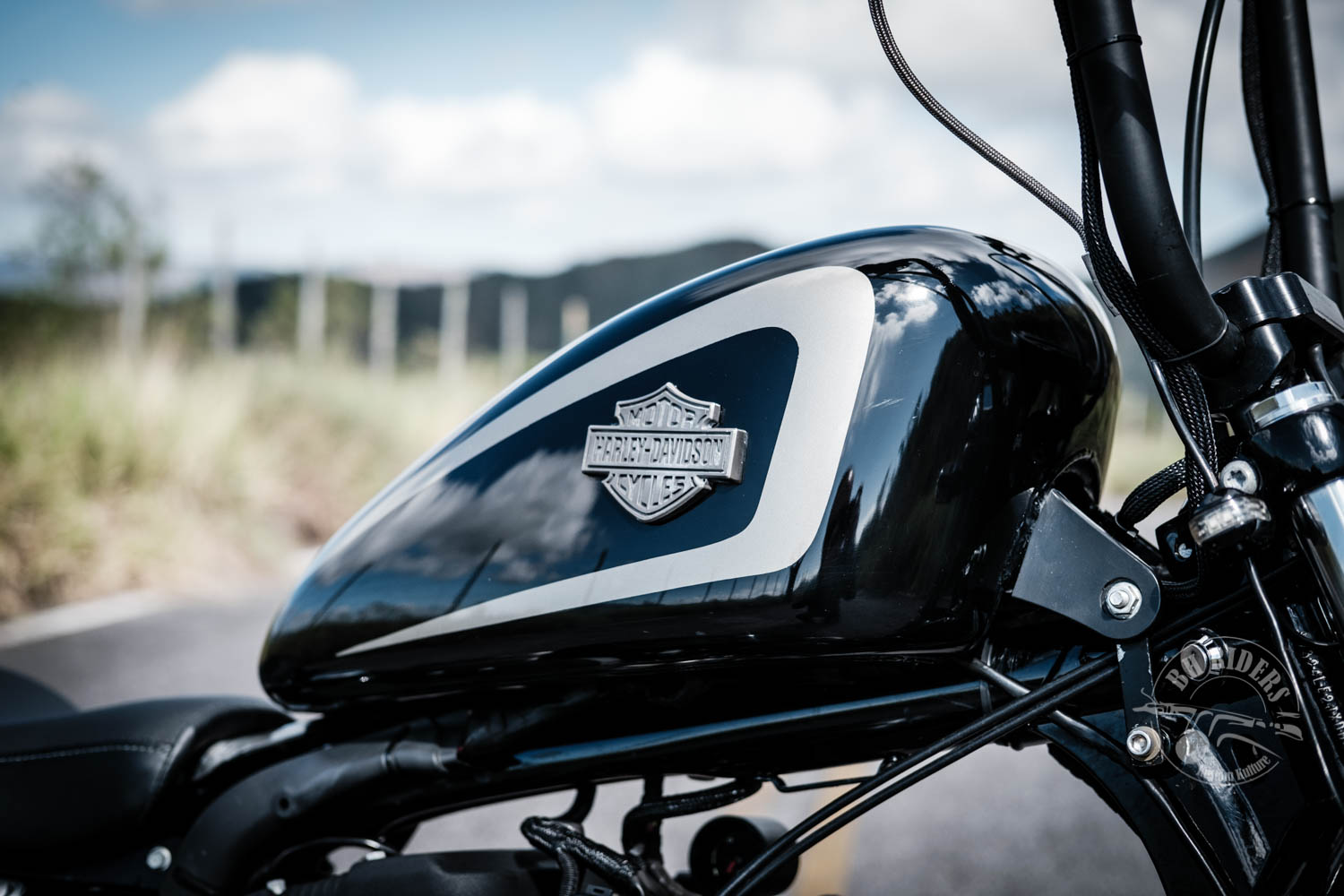 É uma 883 ano 2013, com um belo guidão seca de 14 polegadas, tanque customizado com emblema da HD, velocímetro realocado, banco solo da 48 e mais alguns detalhes bem legais.